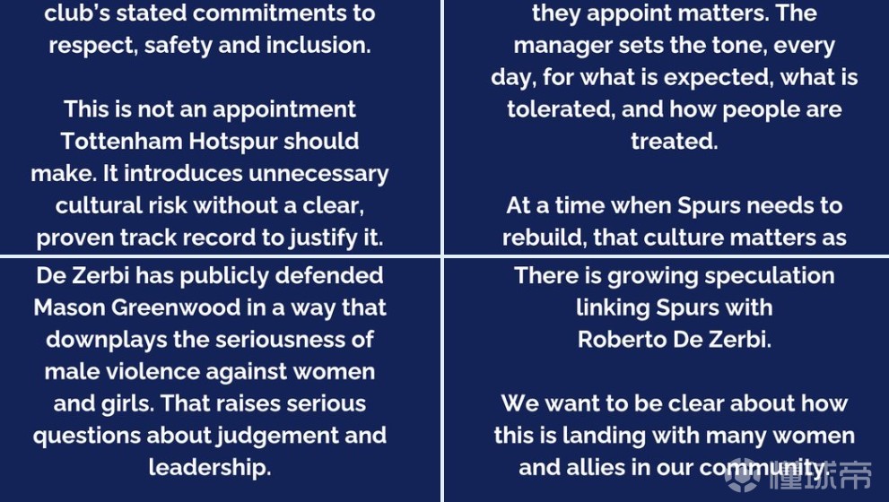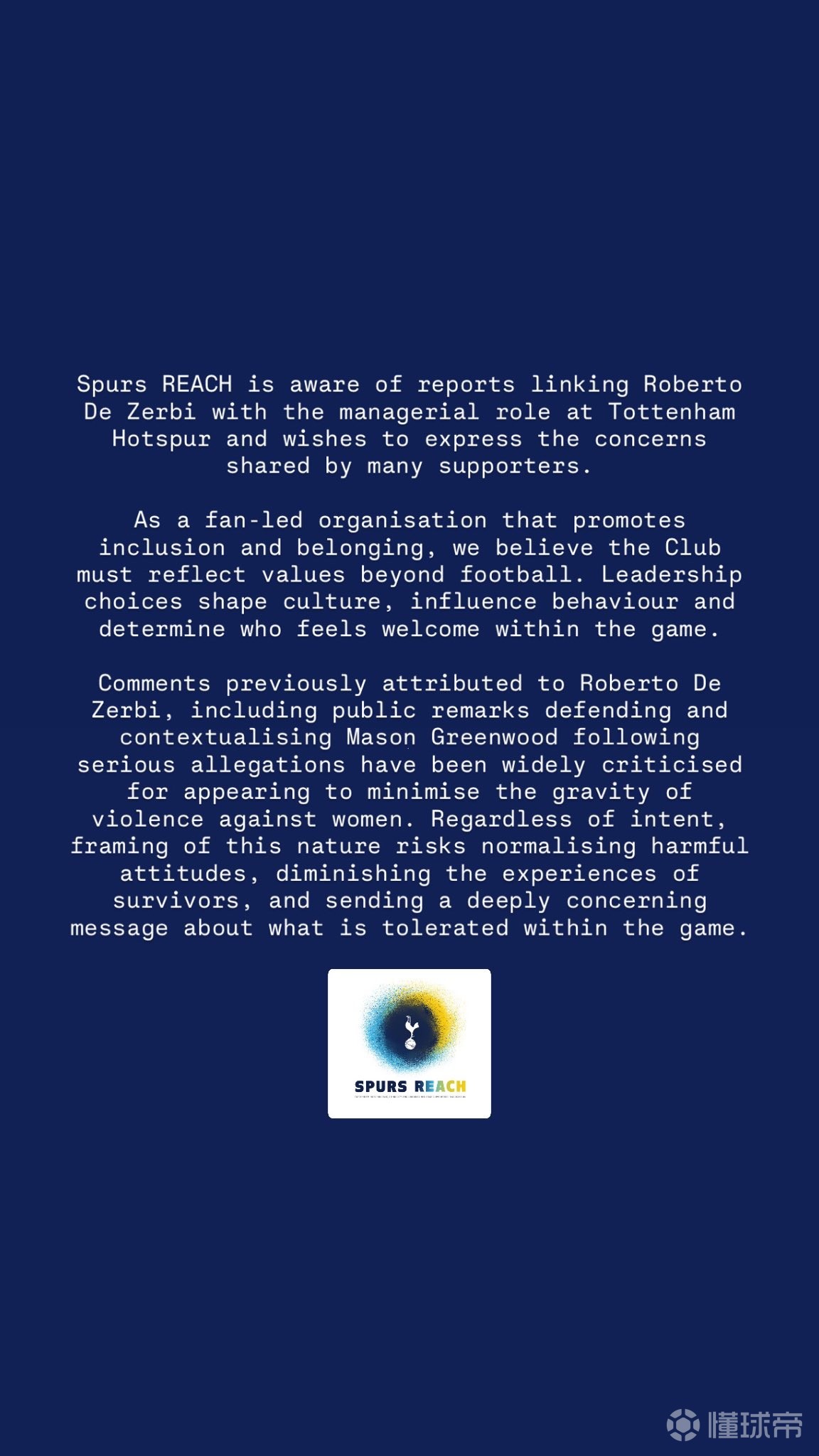 热刺同心(Spurs REACH)注意到了将罗伯托-德泽尔比与热刺主教练职位联系起来的报道,希望在此表达众多球迷共同的担忧。