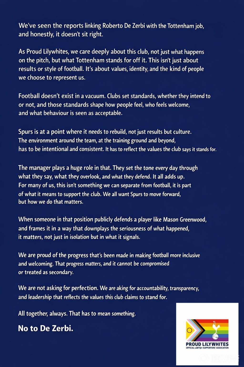 作为“骄傲白鹿巷”,我们深爱着这家俱乐部——不只关心场上的胜负,更在意热刺在场外所代表的意义。这无关战绩或足球风格,而是关乎价值观、身份认同,以及我们选择由谁来代表这支球队。