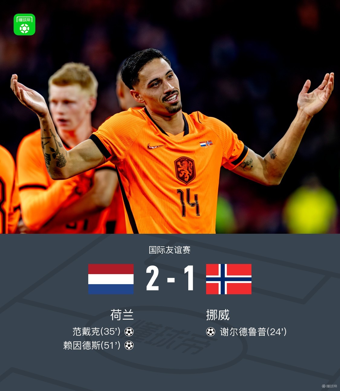 北京时间3月28日国际友谊赛,荷兰对阵挪威。谢尔德鲁普内切兜射首开记录,范戴克利用角球机会头球将比分扳平。下半场赖因德斯破门将比分反超,最终荷兰2-1逆转击败挪威。
