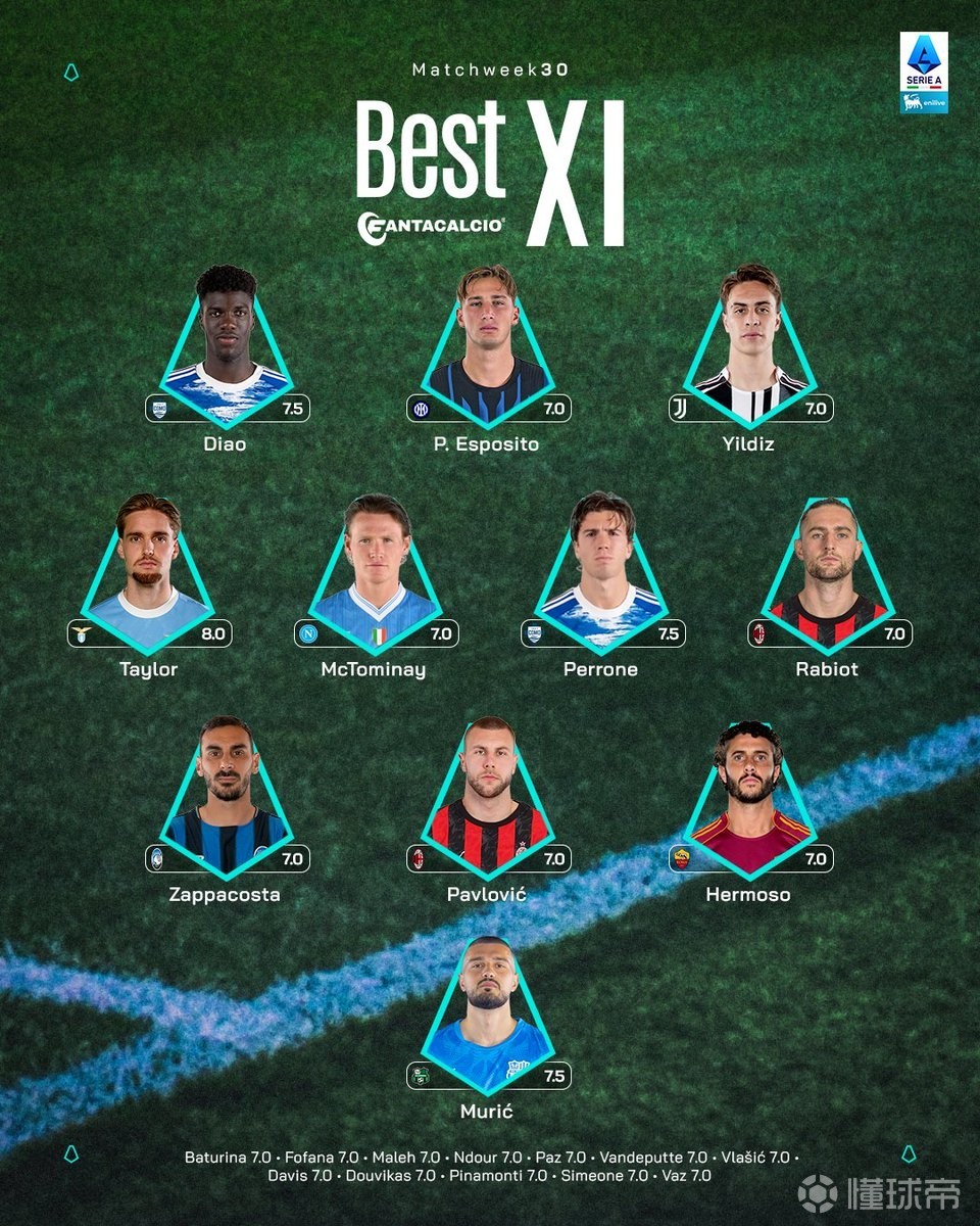 意甲官方第30轮最佳阵容:
